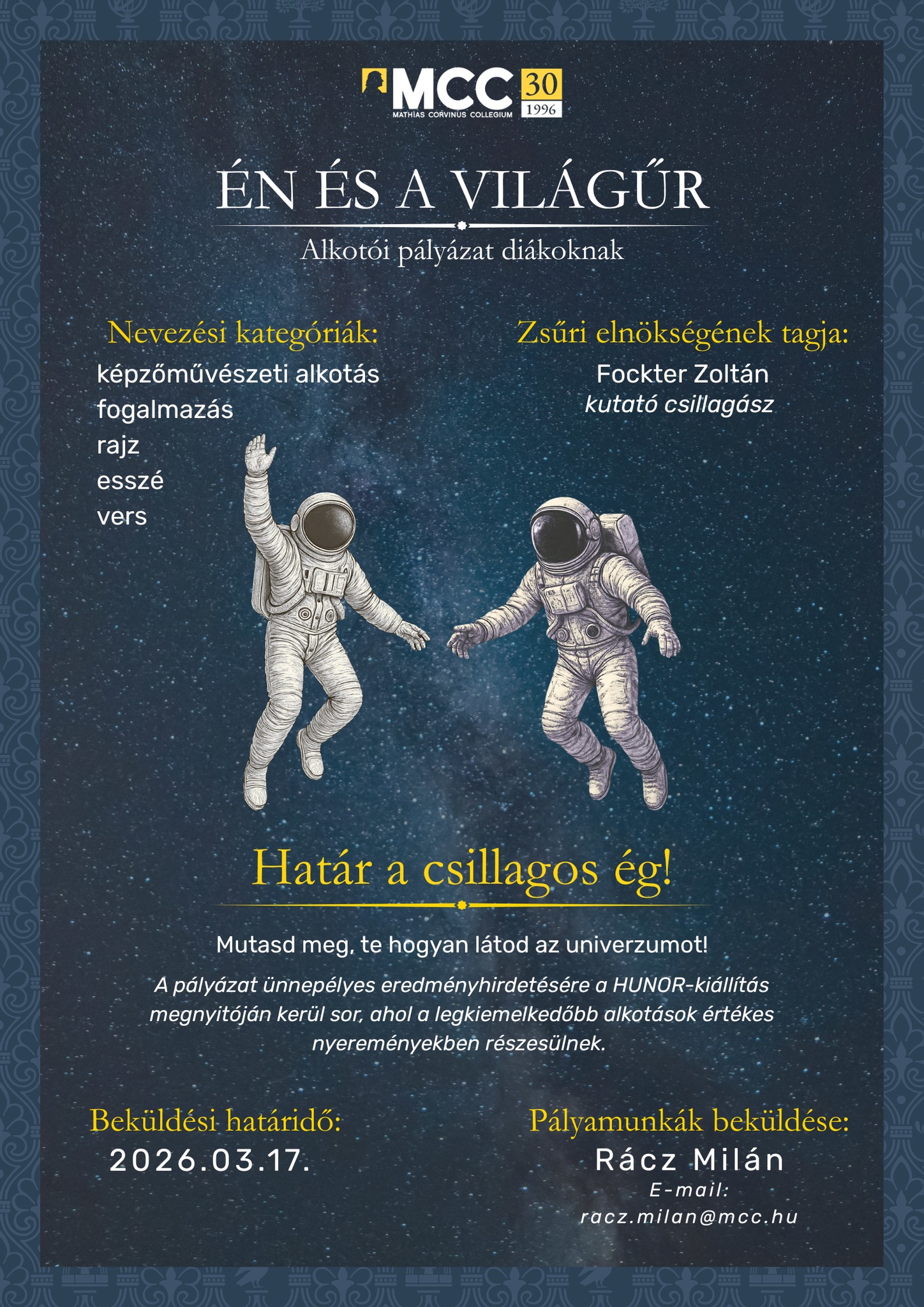 Az MCC Kárpátalja alkotói pályázatot hirdet „Én és a világűr” címmel, amelyre kreatív, egyéni látásmódú pályamunkákat várnak - „Határ a csillagos ég!” ez a pályázat mottója, amely arra ösztönöz, hogy bátran gondolkodj nagyban, és művészi vagy irodalmi formában fogalmazd meg a világűrhöz fűződő gondolataidat. A pályázatra az alábbi kategóriákban lehet nevezni: képzőművészeti alkotás, rajz, esszé, vers, fogalmazás. A pályázatra benyújtott alkotások lehetnek személyes hangvételűek, elgondolkodtatók, álomszerűek vagy akár tudományos ihletésűek is, a lényeg az egyediség és a kreativitás. A pályamunkákat mától várják az MCC Kárpátalja részére a racz.milan@mcc.hu email címre. Beküldési határidő: 2026. 03. 17. A pályázat ünnepélyes eredményhirdetésére és díjátadására a HUNOR-kiállítás megnyitóján kerül sor, ahol a legkiemelkedőbb alkotások készítői értékes nyereményekben részesülnek.